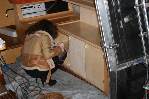 E finalmente qualcosa si muove!! La sala macchine è finalmente pulita e sgrassata, si ricomincia a ricostruire e rimontare. La coibentazione sulla parete di fondo, di nuovo il boiler ed i compressori dei frigoriferi, arrivano i passascafi modificati, gli alberi ed i V Drive revisionati ...... mentre dentro si lavora per realizzare un mobile al posto del divanetto a due posti. E finalmente i motori nuovi "vanno a cuccia", si rimontano gli assi e le eliche e un occhio femminile può finalmente collaudare il mobile !!!